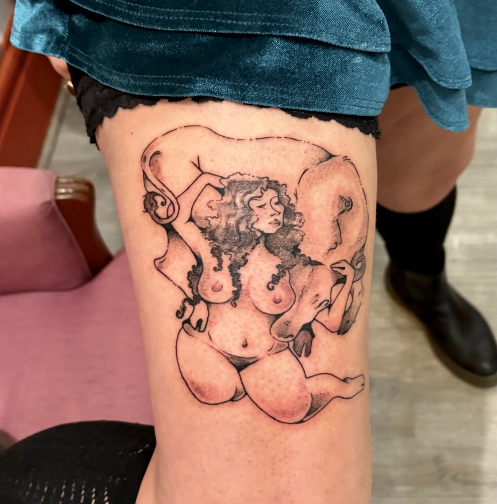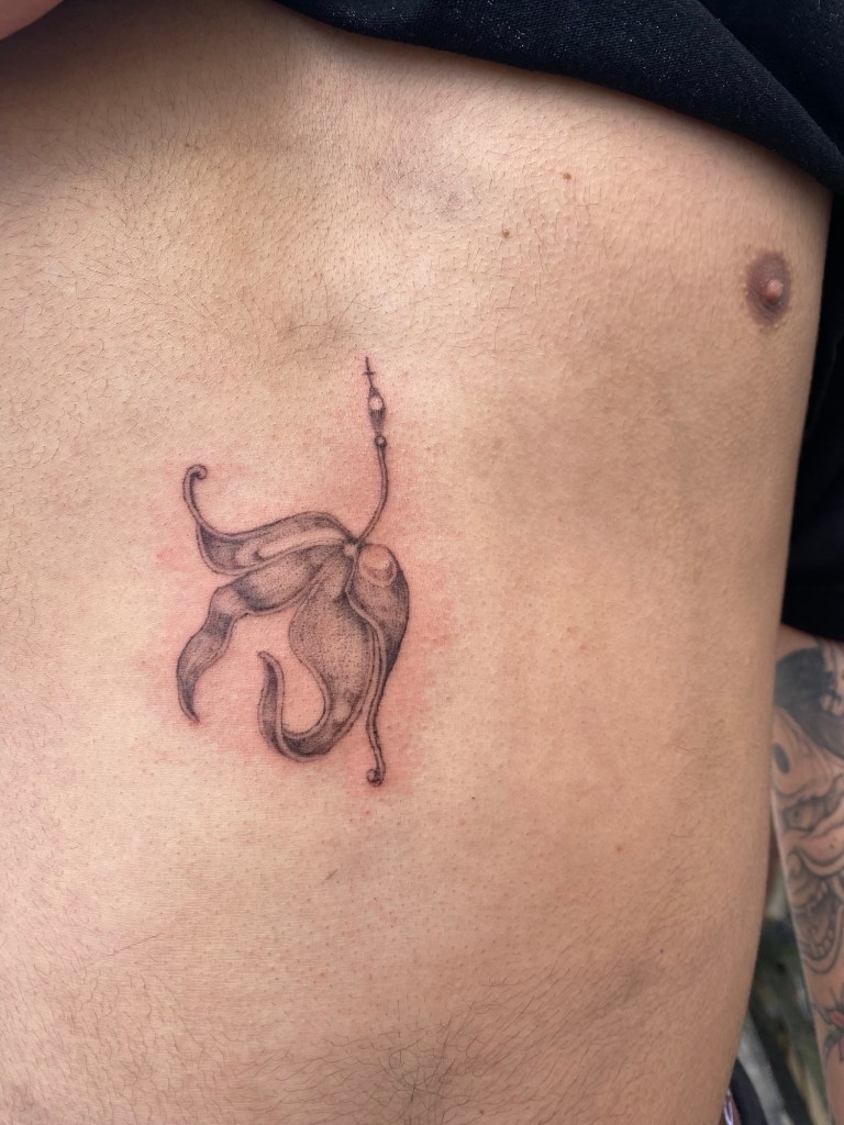 Asha (@earlgayink) is an aquarius, a lesbian, and a 2nd year tattoo artist with a degree in fine arts. They work primarily in a black and grey illustrative style and especially love to tattoo little creatures, pop culture designs, abstract or ornamental shapes, and plants. Asha enjoys collaborating with clients on custom tattoos as well as tattooing flash, and strives to create a comfortable and welcoming environment for all clients and body types.