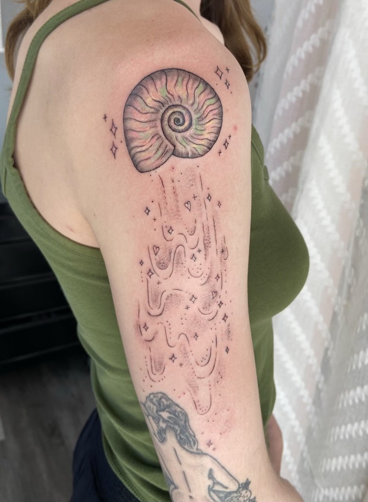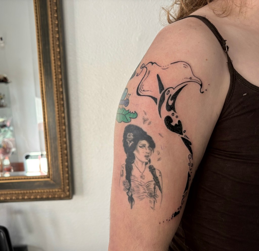 When Asha isn’t tattooing they are usually watching tv and movies with their partner. They especially love Star Trek, She-ra, the Iron Man movies, Interview with the Vampire, and anything made by Julio Torres. They can often also be found playing with their cat Jupiter, doing craft projects, putting together fun outfits, and listening to Carly Rae Jepsen.