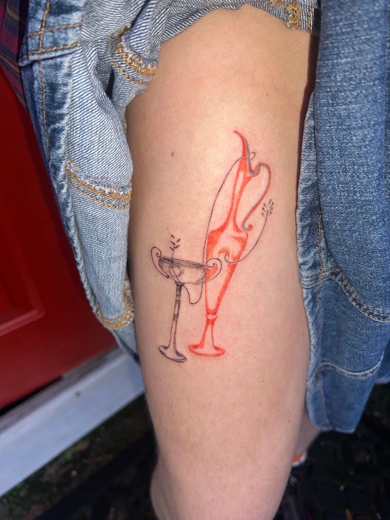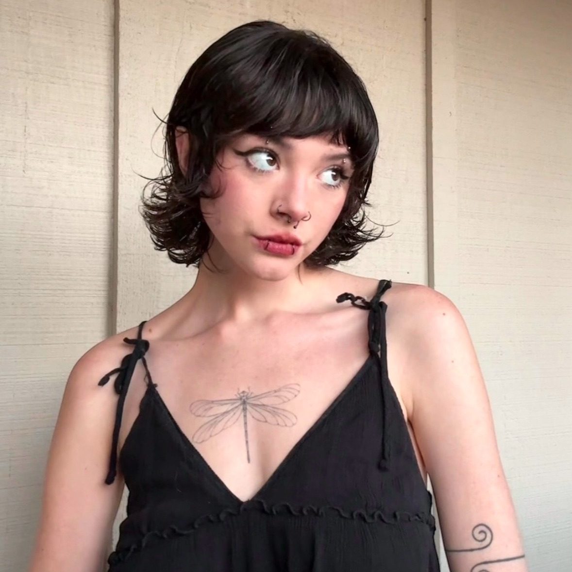 Alice (@etchedcarapace) is twenty-two years old and has worked at Fruity Babes since October 2024. They specialize in illustration-esque designs, where they experiment with line weights and shapes. Their favorite subjects to tattoo include animals, figures, plants, oddities, and other niche media!